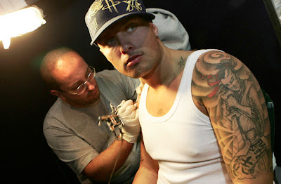 A man with small star tattoo on his shoulder being tattooed.